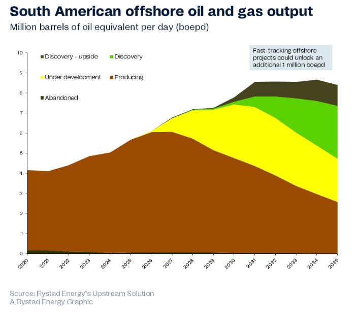 Offshore developments in Brazil, Guyana, and Suriname offer immediate upside, potentially adding over 1 million barrels of oil equivalent per day (boepd) of production in the next decade, supported by about $33 billion in greenfield capex through 2035, the analysis stated.
