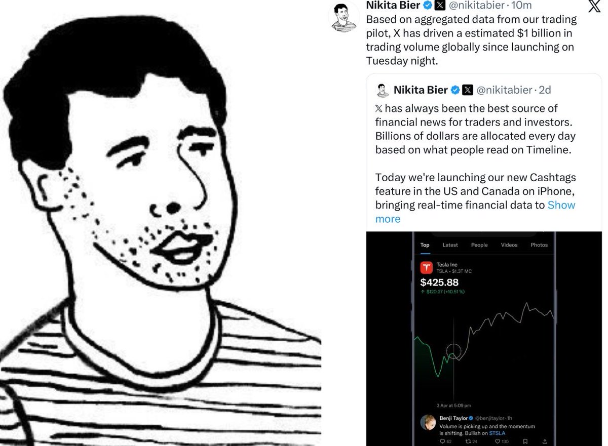 NEW: @X HEAD OF PRODUCT @nikitabier SAYS “BASED ON AGGREGATED DATA FROM OUR TRADING PILOT, X HAS DRIVEN AN ESTIMATED $1 BILLION IN TRADING VOLUME GLOBALLY SINCE LAUNCHING ON TUESDAY NIGHT”