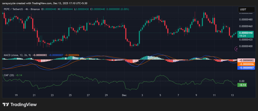The Moving Average Convergence Divergence (MACD) line and signal line of PEPE are settled below the zero line, which indicates bearish momentum. Any upward movement is a temporary rebound unless the lines climb back above zero. Besides, the Chaikin Money Flow (CMF) value at 0.14 suggests strong capital outflow from the asset. Notably, the selling pressure exceeds the buying interest, showing bearish sentiment and weak accumulation in the market.