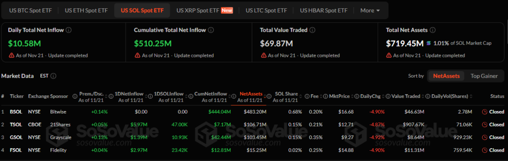 The previous week had been the toughest for Ethereum funds, with $1.28B of outflows recorded between November 11 and 20. The inflow surge on November 21 marked a break from the downward trend as institutional investors showed interest. Other Ether funds, such as Bitwise’s ETHW, also had smaller contributions, which hinted at the recovery of the broader market.