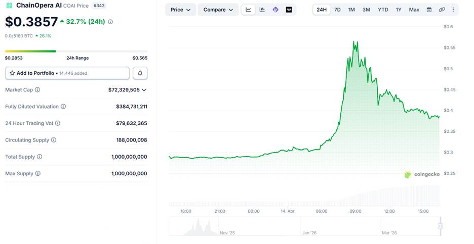 After touching the intraday high of $0.565, COAI didnāt consolidate for long. Instead, it slipped back toward the mid-$0.30 range before stabilising closer to $0.3857 at press time.