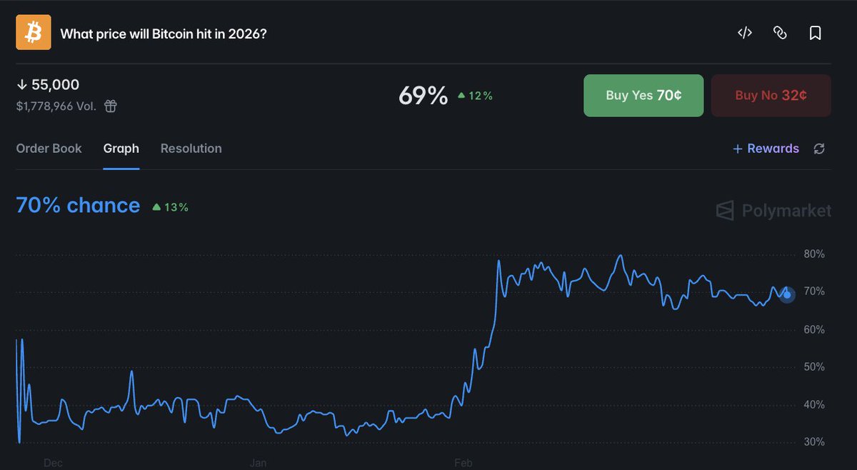 🚨 BEARISH: Polymarket bettors now price in a 70% chance that $BTC drops below $55,000 in 2026, up 13% in recent weeks.