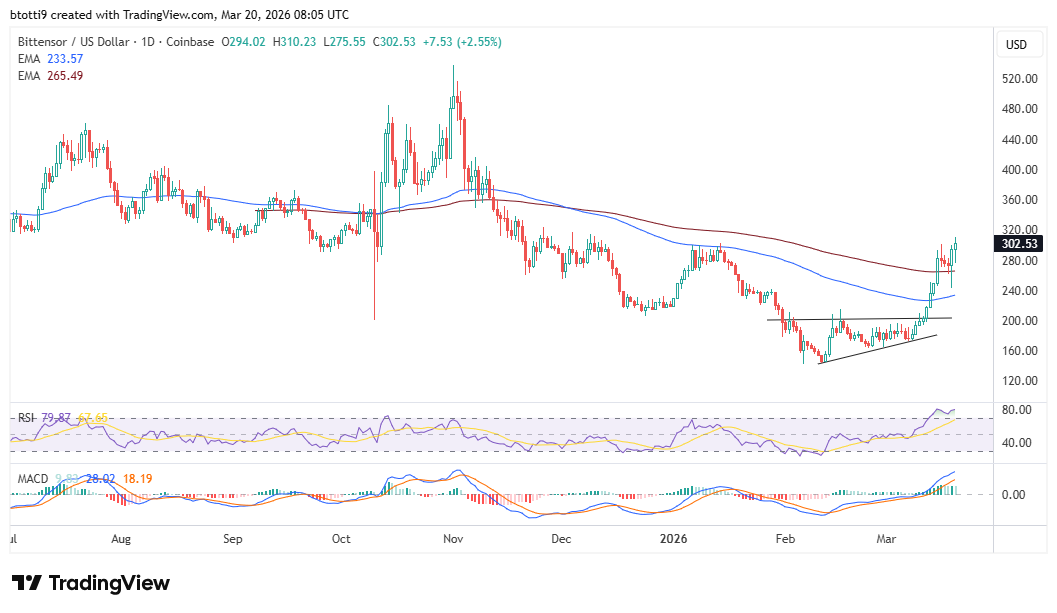 At current levels, Bittensor has formed a V-shaped recovery from lows of $240 a day earlier. Bullish momentum has also flipped prices from lows of $143 on February 11, 2026.