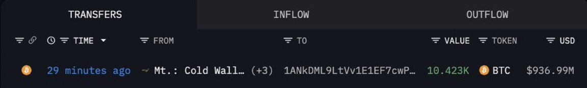 UPDATE 🚨 ARKHAM FLAGS MT. GOX COLD WALLET MOVING 10,422.6 $BTC WORTH $936M IN THE LAST HOUR! No further transactions have been spotted so far.