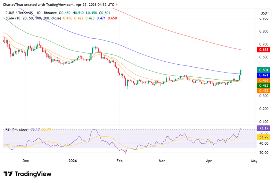 RUNE broke above key short-term moving averages, including its 7-day and 30-day levels near $0.426 and $0.406.