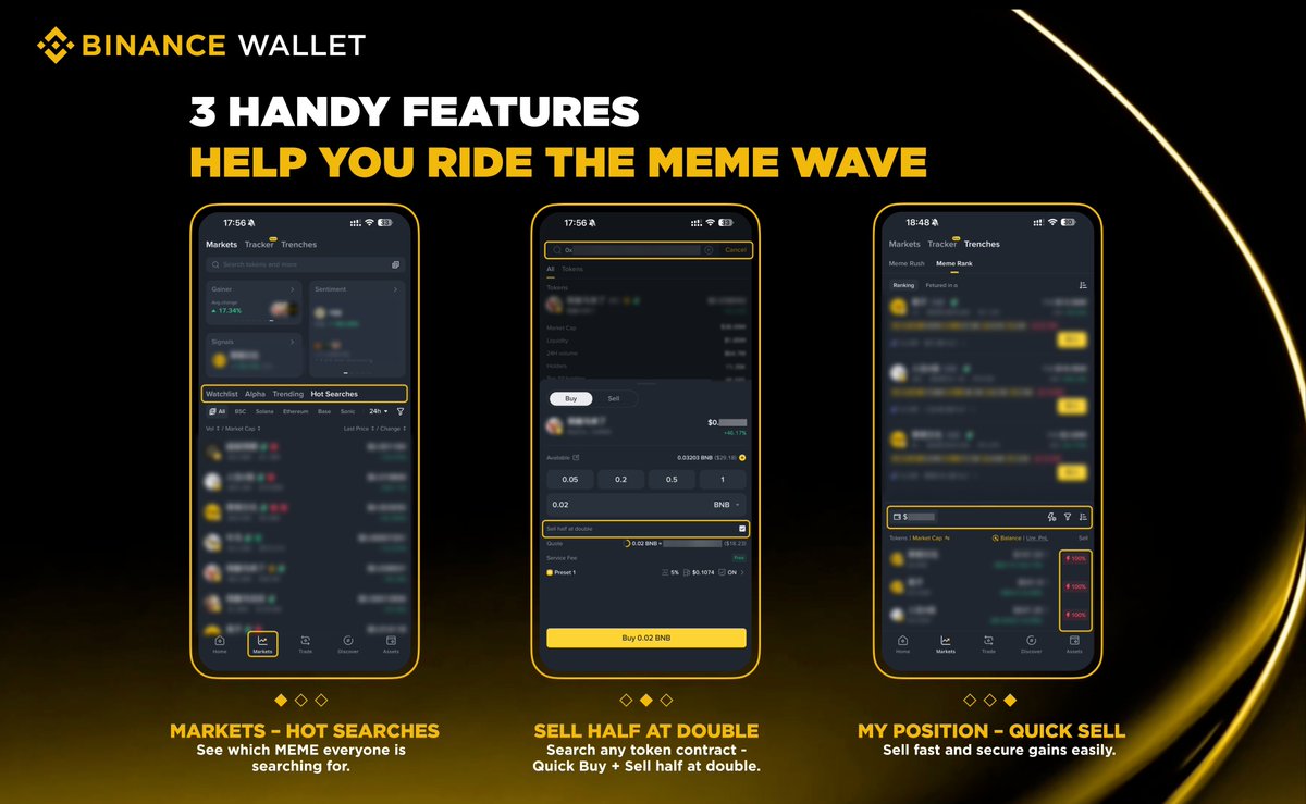 RT by @binance: RT by @binance: 3 handy features to help you ride the meme wave: 1️⃣ Markets – Hot Searches: See which memes everyone is searching for. 2️⃣ Search any token contract – Quick Buy + “Sell half at double”: Automatically set a sell limit order after your buy fills to lock in profits smartly. 3️⃣ My Positions – Quick Sell: Your holdings show up in a handy widget—swipe up to sell fast and secure gains. Try them today! 🚀