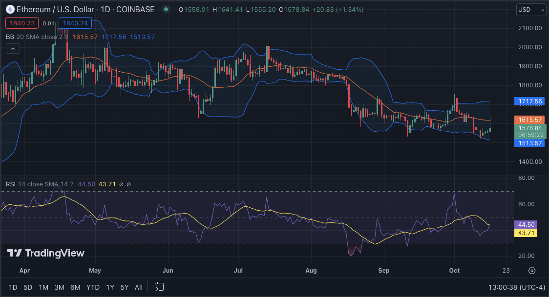 The Ethereum price analysis for 16 October shows bullish activity as the bulls have returned to the price charts. The price has been hovering between $1,5700-1,628 for most hours today. The bulls touched a high of $1,628.16 but were unable to break the resistance levels. As a result of this bullish activity, the Ethereum price has surged to its current value of $1,576.56. ETH token has gained 1.55% in the last 24 hours, with bullish pressure still strong in the market.