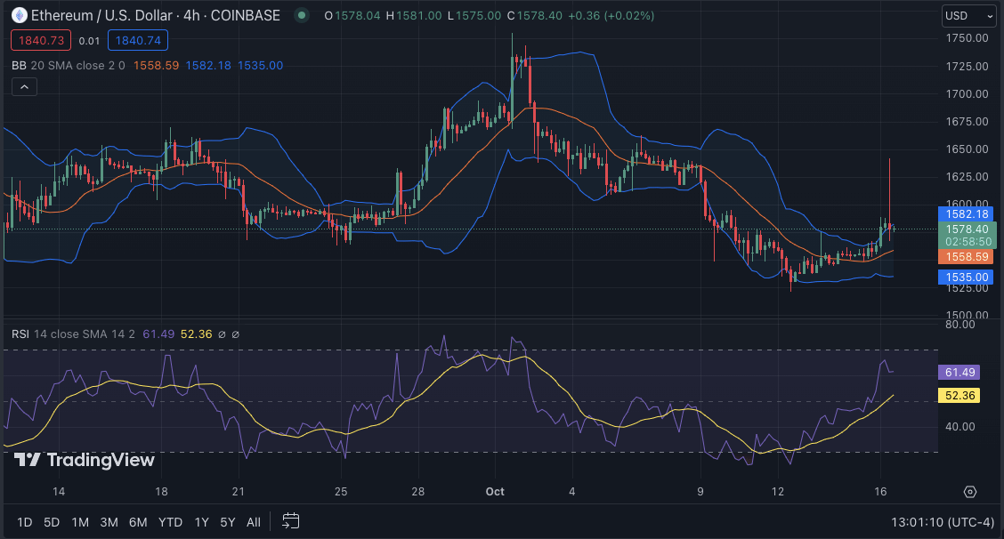The RSI still favors the bulls with its position at 61 levels. The MACD also indicates a bullish trend, with the MACD line trading above the signal line, indicating that the bullish momentum may continue for some time. The histogram is also rising, indicating a strong bullish movement and suggesting that the ETH coin may trade above $1,628 levels shortly. The Bollinger bands on the 4-hour time frame have also widened, indicating a possible price increase in the near future. The upper and lower Bollinger bands are seen at $1,582 and $1,535, respectively.