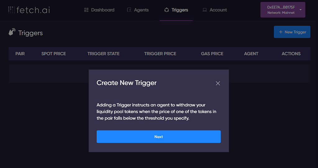 You will also need some ETH (or BNB if you are using the app on BSC) for the payment of gas fees during the setup process. Agents also need ETH in order to execute the liquidity withdrawal transaction when the pre-determined trigger price has been reached. Therefore, we recommend having at least 0.1 ETH in your MetaMask wallets. In the case of BSC, we recommend having at least 0.01 BNB.