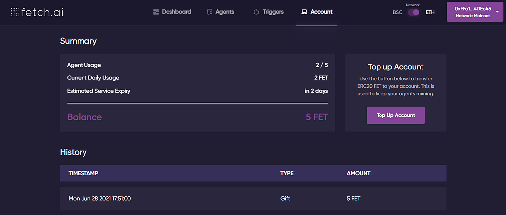 If users want to keep their Agents active, they will need to top up the app with FET tokens on the Ethereum network (ERC-20). This could be done from the dashboard. Once the user deposits FET in the DeFi Agent application, they will be able to see an estimate of the remaining time until service expiry and the monthly FET usage.