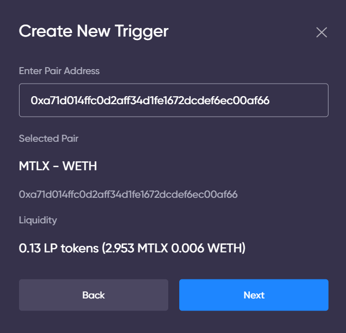 5) In the next screen you will be able to set the price that will trigger the Agent into action to withdrawal your liquidity from the pool. You can set the price for either MTLX/WETH or WETH/MTLX by clicking on the “MTLX/WETH” box on the right.