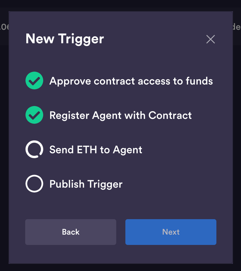 Once you choose the Gas Price and click “Next”, you will see the application begin the process of setting up your trigger. You will need to approve several MetaMask transactions.