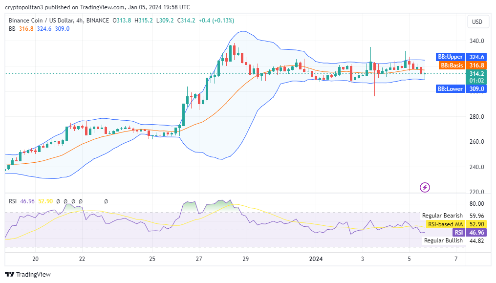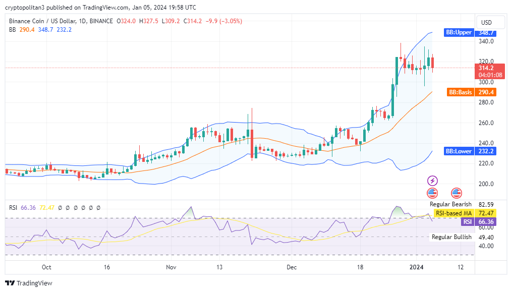 The latest one-day and four-hour Binance Coin price analysis for 05 January 2024 confirms signs of an aggravating bearish trend. Although the bullish wave remained intense earlier this week, today the bears were able to bounce back swiftly. As a result of the ongoing bearish swing, the cryptocurrency value has sunk to $314.2 low.
